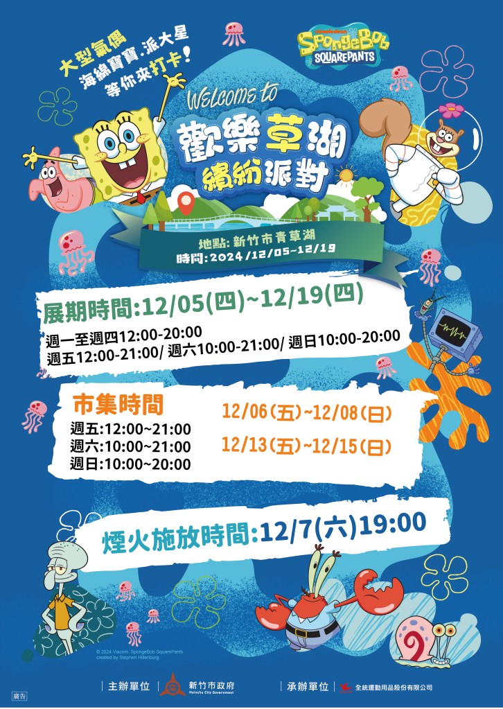 新竹市政府將於12月5日至19日在青草湖首次舉辦為期兩週的「歡樂草湖X繽紛派對」活動。城銷處表示,此次活動以深受大小朋友喜愛的卡通角色「海綿寶寶」為主題,結合青草湖環湖步道特色,營造盛大的歡樂派對,現場將有大型氣偶展覽、經典人物打卡區、市集及多樣化的表演活動,12月7日更規劃開幕重頭戲「300秒壯麗煙火秀」,活動期間另有集章、拍照打卡兌換海綿寶寶獨家小禮,現場也將販售海綿寶寶限定週邊商品,為市民及遊客打造一場視覺、聽覺與味覺的歡樂盛宴。