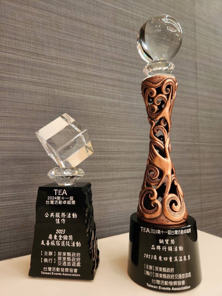 屏東縣政府主辦的「2023屏東四重溪溫泉季」與「2023屏東金鑰獎友善旅宿選拔活動」,於第十一屆台灣活動卓越獎分別榮獲「銅質獎」及「佳作」!縣府表示,「屏東在地活動品牌」獨一無二的城市形象獲得矚目以及透過「屏東公共服務」為城市行銷、宣揚公共理念!
