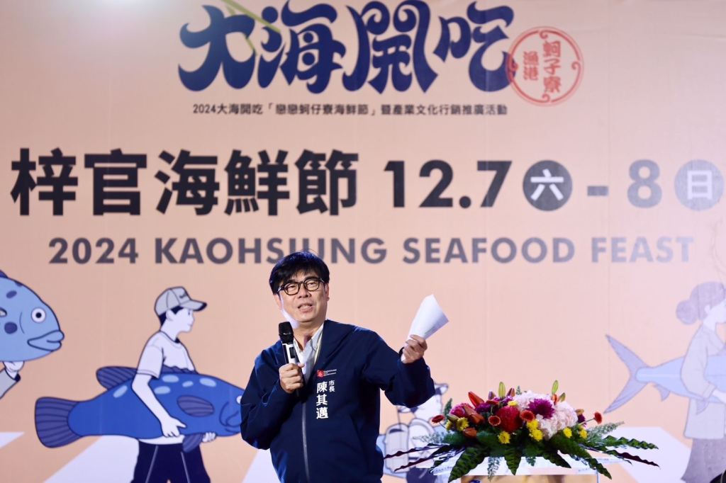 「2024大海開吃」系列活動來到最後一站梓官,高雄市長陳其邁今(7)晚出席梓官海鮮節-海鮮宴開幕儀式,農業部長陳駿季、漁業署長王茂城等貴賓也親臨現場與會。陳其邁致詞感謝中央大力支持梓官的冷鏈設備與漁港改善經費,他也請與會民眾在海風吹拂下,盡情享用海鮮大餐。