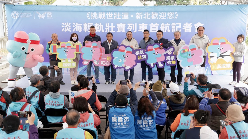 侯友宜表示,2025雙北世界壯年運動會是新北市明年盛事,世壯運再次燃燒大家運動魂,不論是退役國手還是滿腔熱血的民間體育團體,都將因為這場賽會串聯在一起,我也將站上賽場,很有可能籤表出來,我的對手就是在座各位。而且,為讓更多人知道雙北世界壯年運動會,不僅桃園機場捷運2輛壯寶列車已經在12月6日率先起跑,新北環狀線及臺北板南線壯寶列車也接力啟航,今天特別選在淡海輕軌辦記者會就是要再次告訴大家,淡水在上個月人口數已突破20萬大關,北台灣第一條輕軌─淡海輕軌乘載了它因應新市鎮開發、紓解交通運輸的使命,如同世壯運肩負倡導終身運動、全民運動的精神,從今天開始,壯寶列車將奔馳在金色水岸、遠眺淡江大橋、越過漁人碼頭,串起運動觀光之旅,賽會期間「新北歡迎您」。