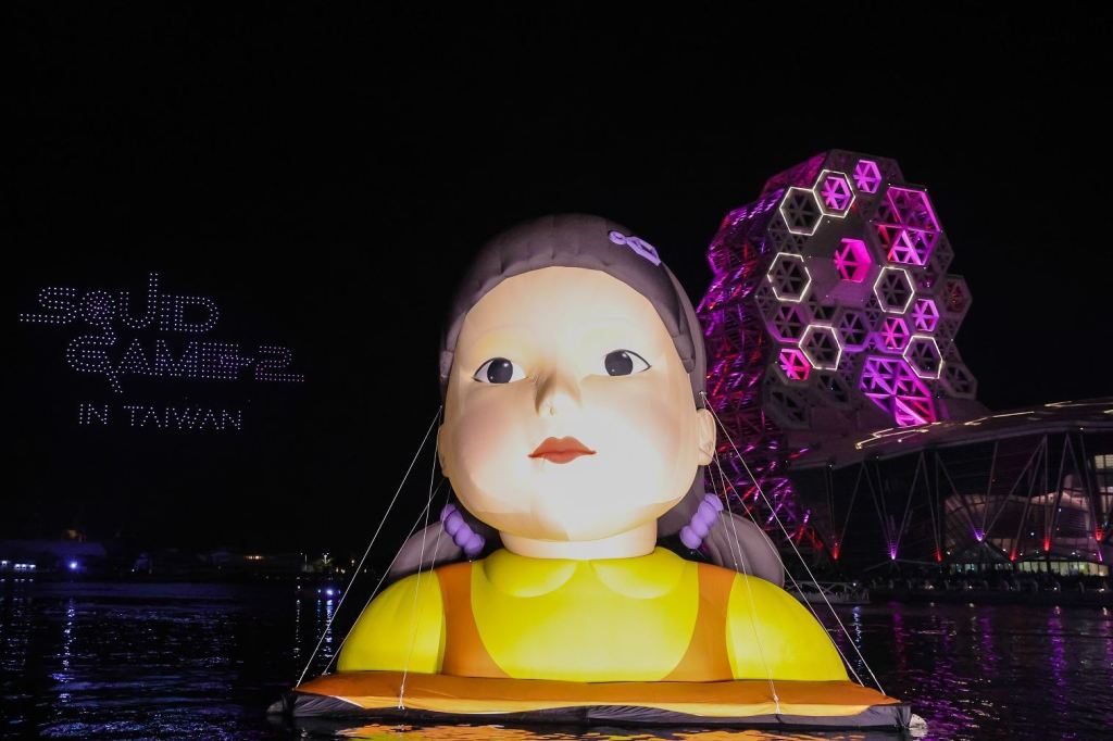 隨後的無人機展演更是精彩萬分,無人機大秀集結600台無人機,展示出了《魷魚遊戲》最經典的角色與元素,包含英熙娃娃、粉紅守衛、魷魚遊戲玩家奔跑的樣子、主角成奇勳的代號456、金豬撲滿等,更加上了「SQUID GAME IN TAIWAN」的字樣,各種圖案變化萬千,驚喜感滿分,讓民眾驚呼連連的同時,也更能感受《魷魚遊戲》帶來的刺激和精彩。巨型英熙娃娃與輕軌主題列車也將持續至明年1月5日,在高雄海灣與市區美景中,陪伴民眾與各地粉絲!
