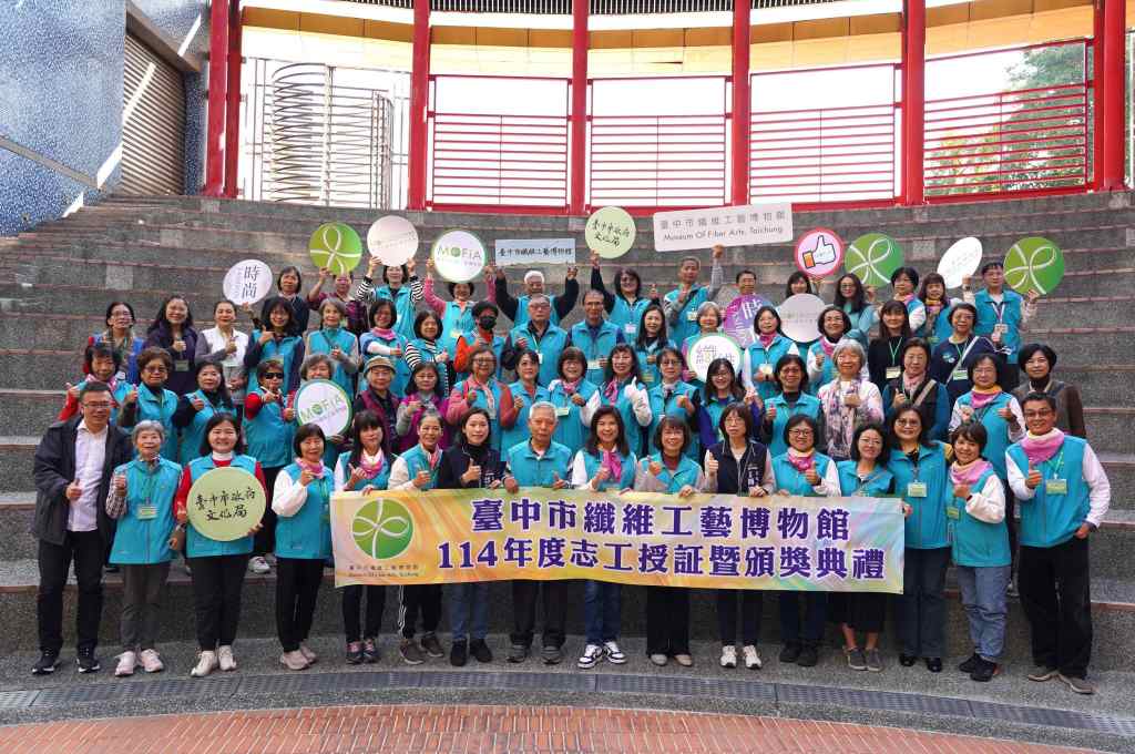 臺中市政府文化局今日辦理114年臺中市纖維工藝博物館志工授證暨頒獎典禮,共有76位志工獲頒聘書,同時頒獎表揚獲得衛福部志願服務獎的志工、幹部及服務績優志工等。志工隊也製作精采影片回顧今年的活動點滴,並舉辦新舊任隊長交接儀式和歡迎新進成員,期許志工團隊在新的一年更加茁壯,現場洋溢著溫馨熱絡的氣氛。