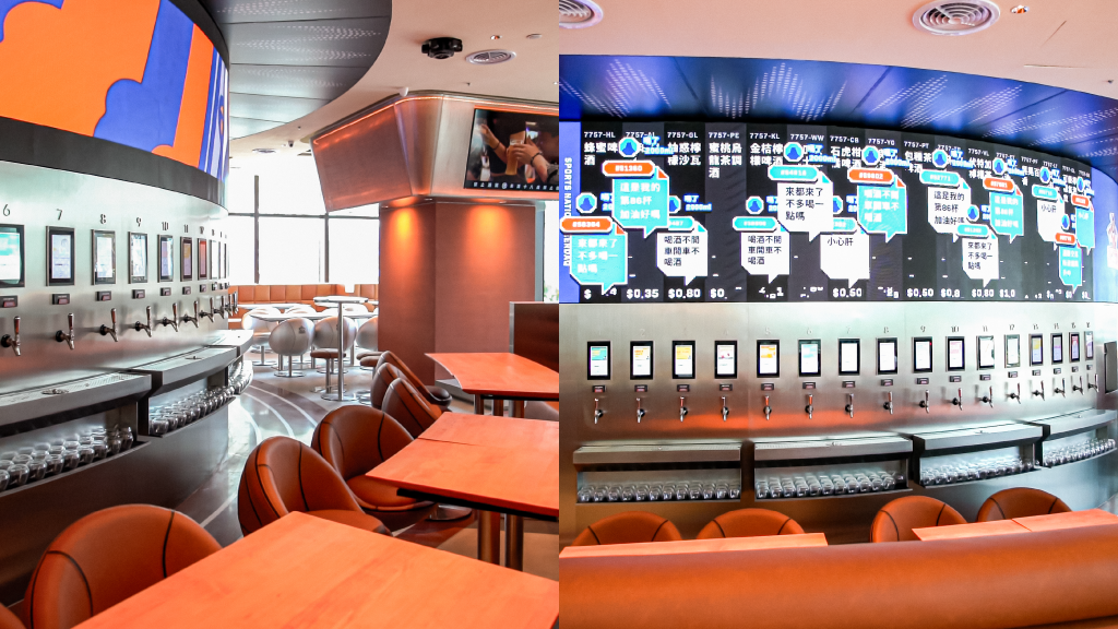 得到台灣專利的 SPORTS NATION全球首創電子酒精交易所結合自助智慧取酒牆,一直是品牌最具代表性的招牌體驗。靈感來自股市交易概念,透過動態螢幕與智慧取酒牆結合,每款酒的價格都會依照即時銷量產生股市般的漲跌波動,越多人取用的酒款價格越高,漲幅最高可達120%,若半小時無人取用,價格便會下跌4%,最多甚至下殺至半價,讓喝酒這件事多了更多刺激、互動與趣味。