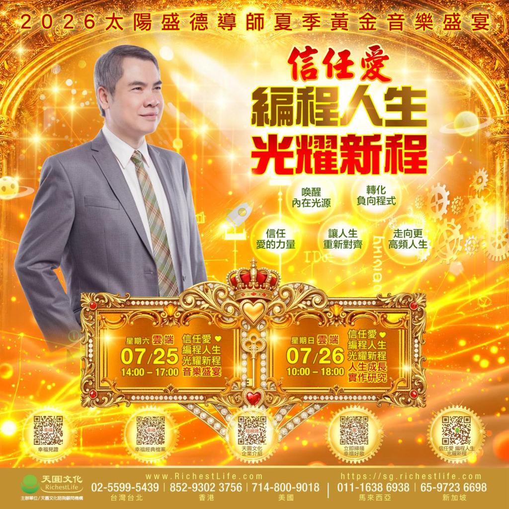 天圓文化預告,將於7月25日至26日舉辦大型全球活動——「信任愛 編程人生 光耀新程」。活動將啟動全球連線共振,由太陽盛德導師親自授課,帶領參與者全面提升身心靈能量,開啟嶄新的人生篇章。